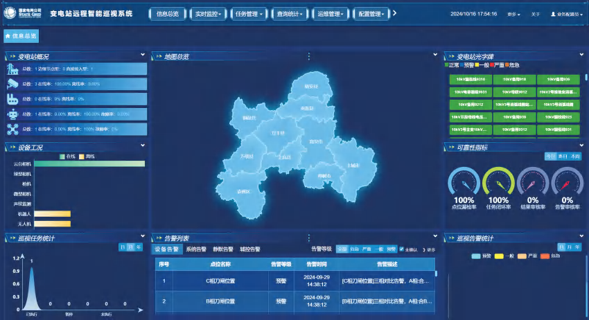 变电站远程智能巡视系统是一 款面向变电设备的智能巡视系统。系统应用于变电站站端,对摄像机、机器人、无人机及声纹监测装置实现统一接入,结合先 进的信息通信技术和人工智能技术,实现数据采集、智能分析、任务管理、巡视监控、巡视设备管理、智能联动、一键顺控视 频确认等功能。实现变电站的全方位、全天候、自主化巡检,显著提升巡检效率和安全性,减轻运维人员负担。该系统可依据 现场需求,实现多设备统一接入、三维可视化管理、智能分析告警、数据共享与联动等功能,是变电站数字化运维管理的重要工具。