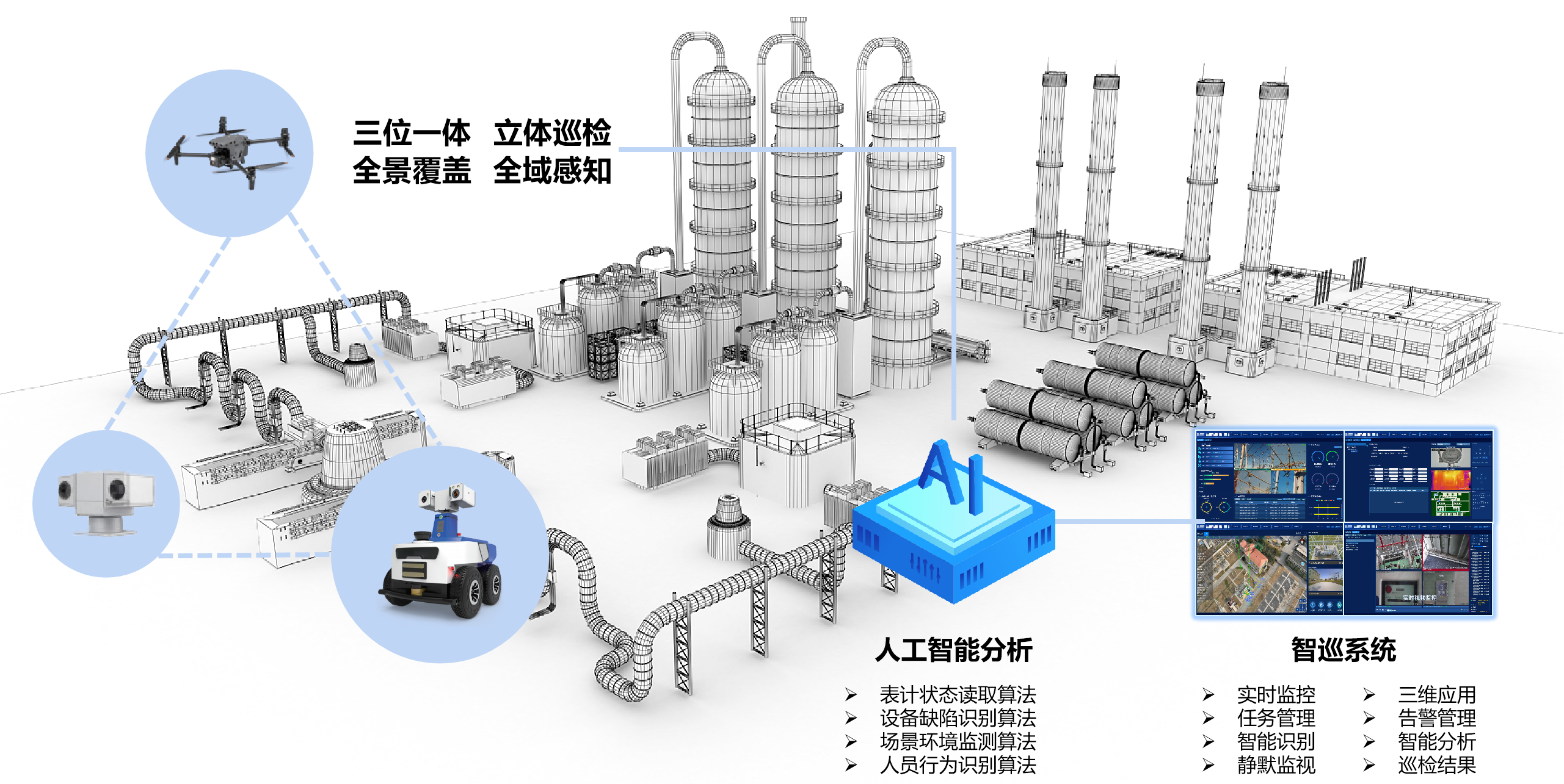 用智能机器人、无人机按预设路线采集数据, 强大算力瞬间处理海量信息,缩短巡检周期,助企业高频掌握设备状况,保障生产。